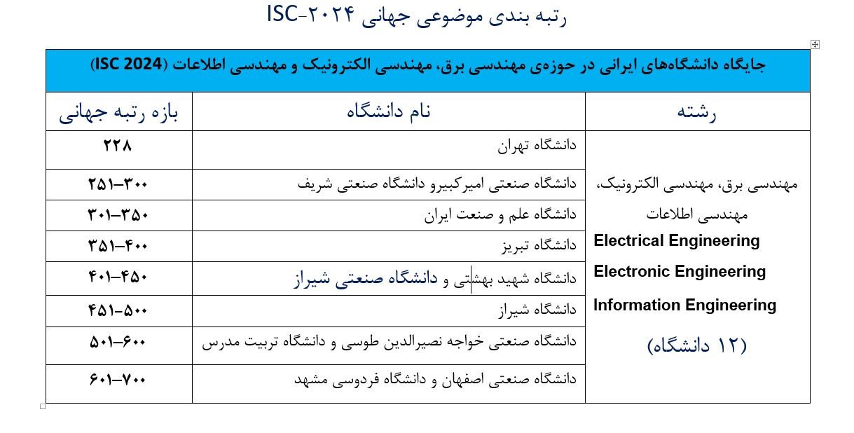 رتبه بندی جهانی  ISC  برای اولین بار در سال 2018  انتشار یافت و ضعیت کلیه کشورها به ویژه کشورهای اسلامی را در مقایسه با دانشگاههای دنیا رصد مینماید. در حال حاضر این رتبه بندی در 22 حوزه موضوعی در شش سال متوالی انجام گرفته و نتایج این رتبه بندی در سال 2024  با حضور بیش از دو هزار دانشگاه از سراسر دنیا منتشر نموده است. بر اساس نتایج رسمی رتبه‌بندی موضوعی جهانی ISC (مؤسسه استنادی علوم و فناوری جهان اسلام) در سال ۲۰۲۴، دانشگاه صنعتی شیراز در حوزه‌ی مهندسی برق، مهندسی الکترونیک و مهندسی اطلاعات موفق به کسب جایگاهی قابل توجه در میان دانشگاه‌های بین‌المللی شد. این دانشگاه با کسب رتبه جهانی ۴۵۰۴۰۱ در این حوزه، توانست در کنار دانشگاه‌های ممتاز کشور مانند تهران، صنعتی شریف و امیرکبیر قرار گیرد. در این حوزه موضوعی از ایران تنها 12 دانشگاه حضور داشته است که دانشگاه صنعتی شیراز با کسب رتبه پنجم برای اولین بار جایگاه نسبتا خوبی را کسب نموده است. دانشگاههای تهران رتبه اول، صنعتی امیر کبیر و صنعتی شریف  مشترکا رتبه دوم، دانشگاه  علم و صنعت ایران رتبه سوم، دانشگاه تبریز رتبه چهارم و دانشگاه صنعی شیراز و شهید بهشتی مشترکا رتبه پنجم را کسب نموده اند.